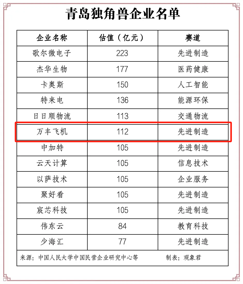 青岛城投投资企业万丰飞机蝉联全球独角兽企业500强