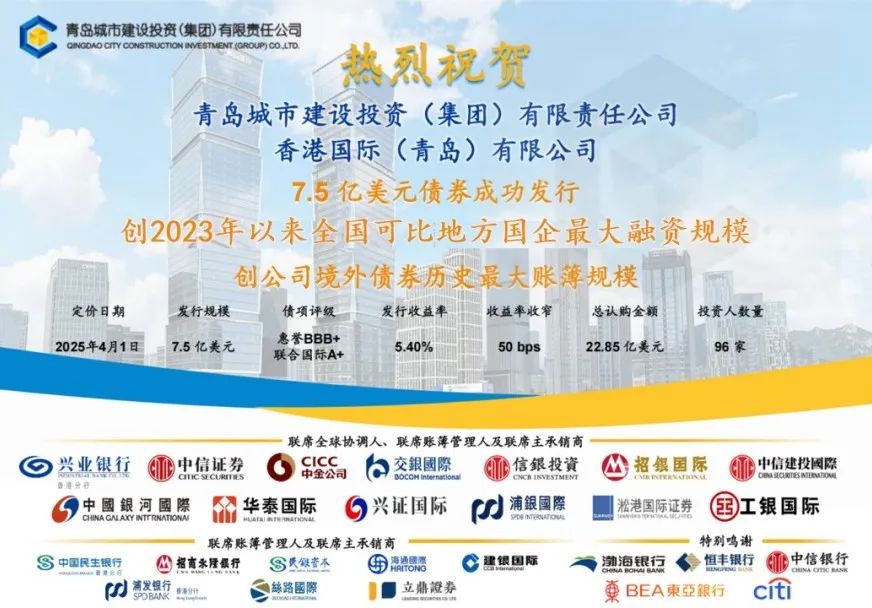 4月1日,196体育app通过境外子公司香港国际(青岛)有限公司成功定价3年期7.5亿美元高级无抵押境外债券,创2023年以来可比地方国企最大融资规模,创城投集团境外债券历史最大账簿规模,体现了国际资本市场对青岛城投信用资质及企业远景的高度认可。