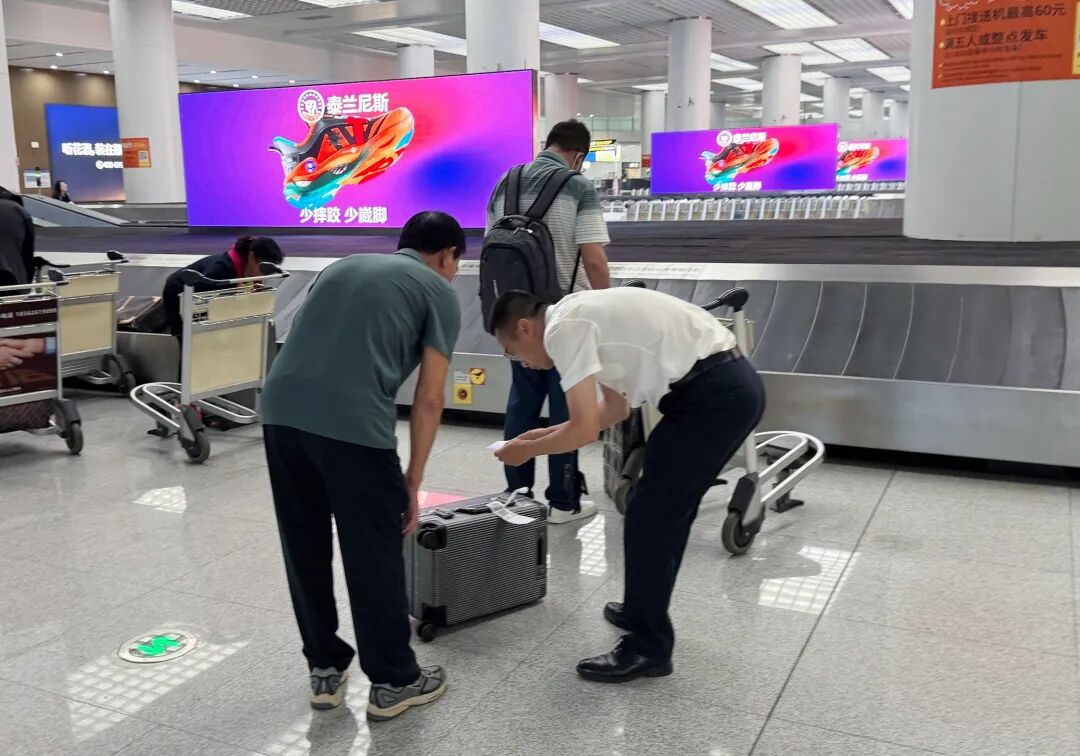 (图为青岛航空地面服务人员协助旅客提取行李)