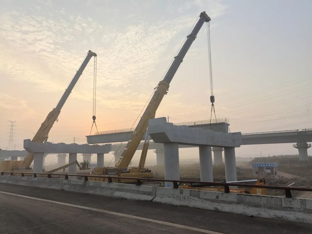 (图为青兰高速改扩建工程ZT1标段大沽河特大桥首榀箱梁架设现场)