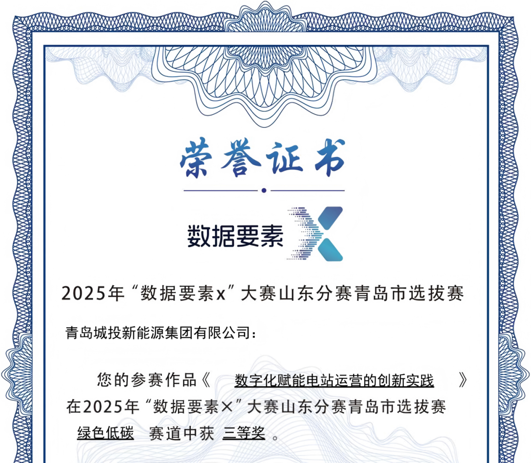 近日,青岛城投新能源集团《数字化赋能电站运营的创新实践》案例,荣获青岛市2025年“数据要素x”大赛三等奖。