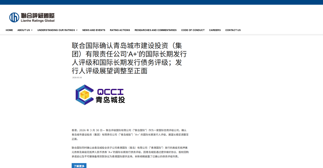 联合国际对青岛城投在青岛市的战略重要性给予高度认可,本次展望上调充分体现了境内外资本市场对青岛城投稳健经营的长期信心。未来,青岛城投将坚定发展方向不动摇,紧密匹配青岛市政府“10+1”创新产业体系,聚焦“2+2”主业新格局,深化“城投+产投”战略转型,推动“十五五”开局之年各项工作实现新突破、取得新成效,以实干实绩为青岛市经济社会发展贡献城投力量。